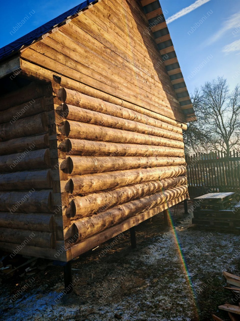 - Сруб бани — пятистенок (планировка свободная) из бревна хвойных пород древесины (сосна, ель) диаметром 220-300 мм — внутри тесанный (полулафет)